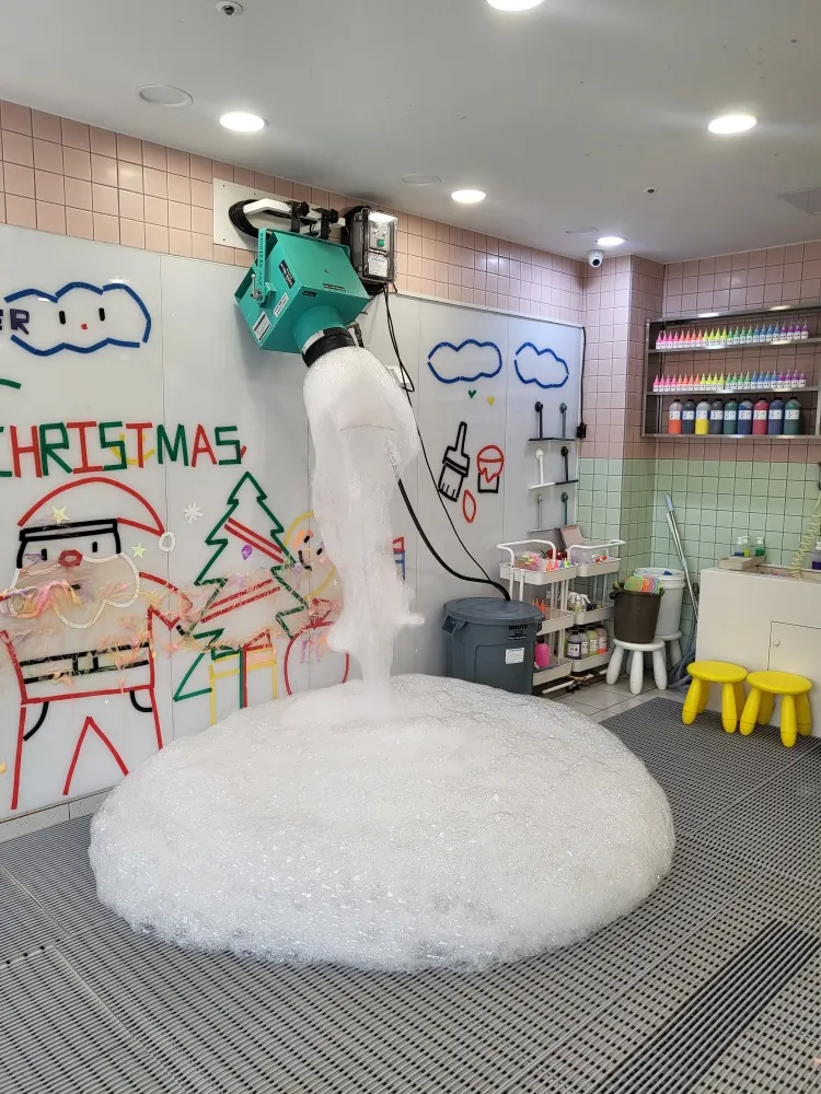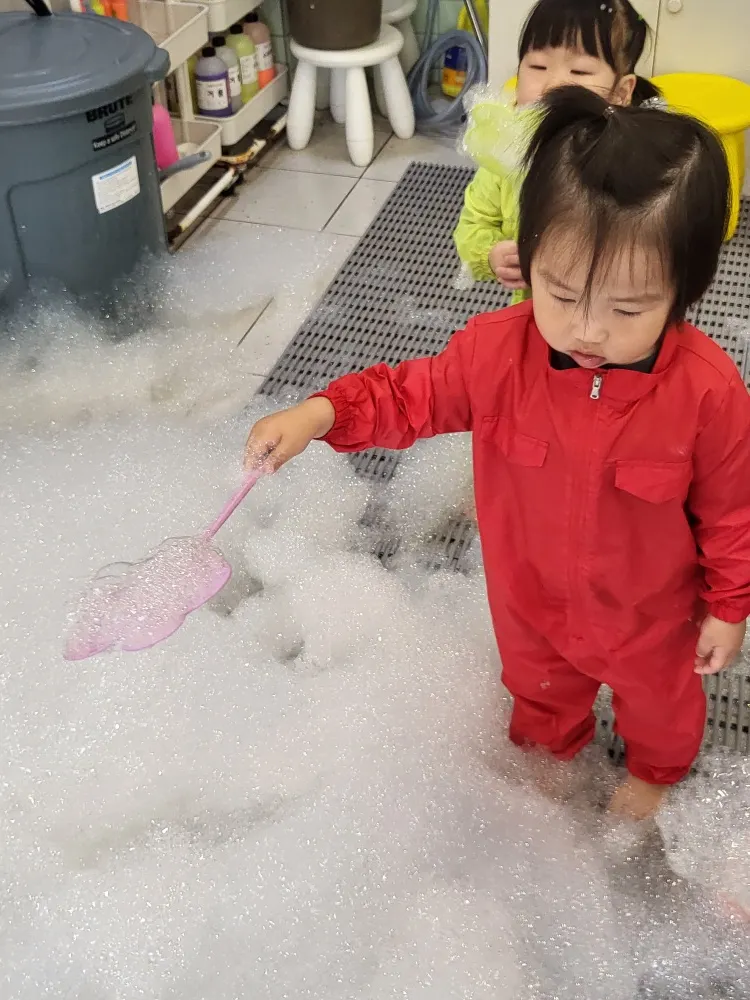 거품을 파리채로 집어 바닥에 놓고 쳐보기도 하고~