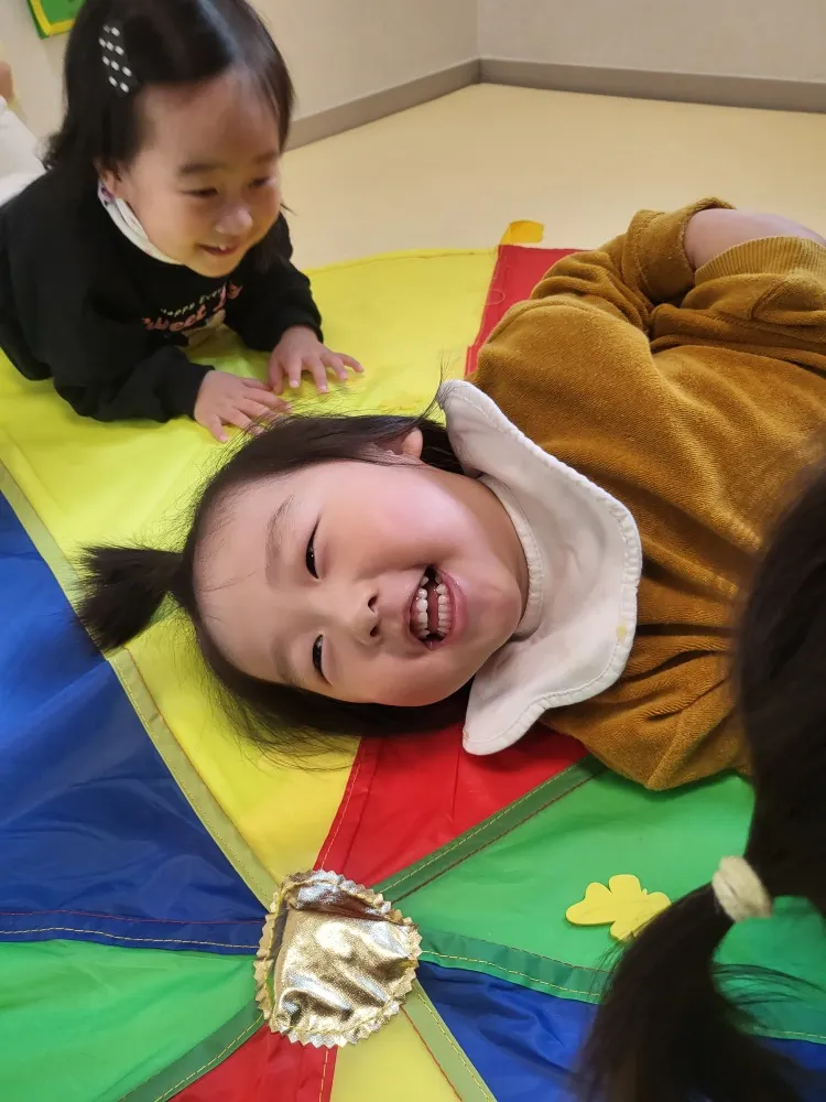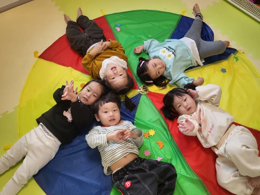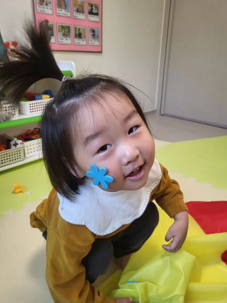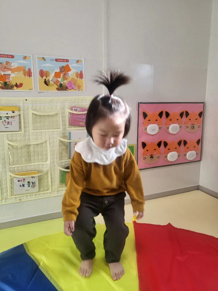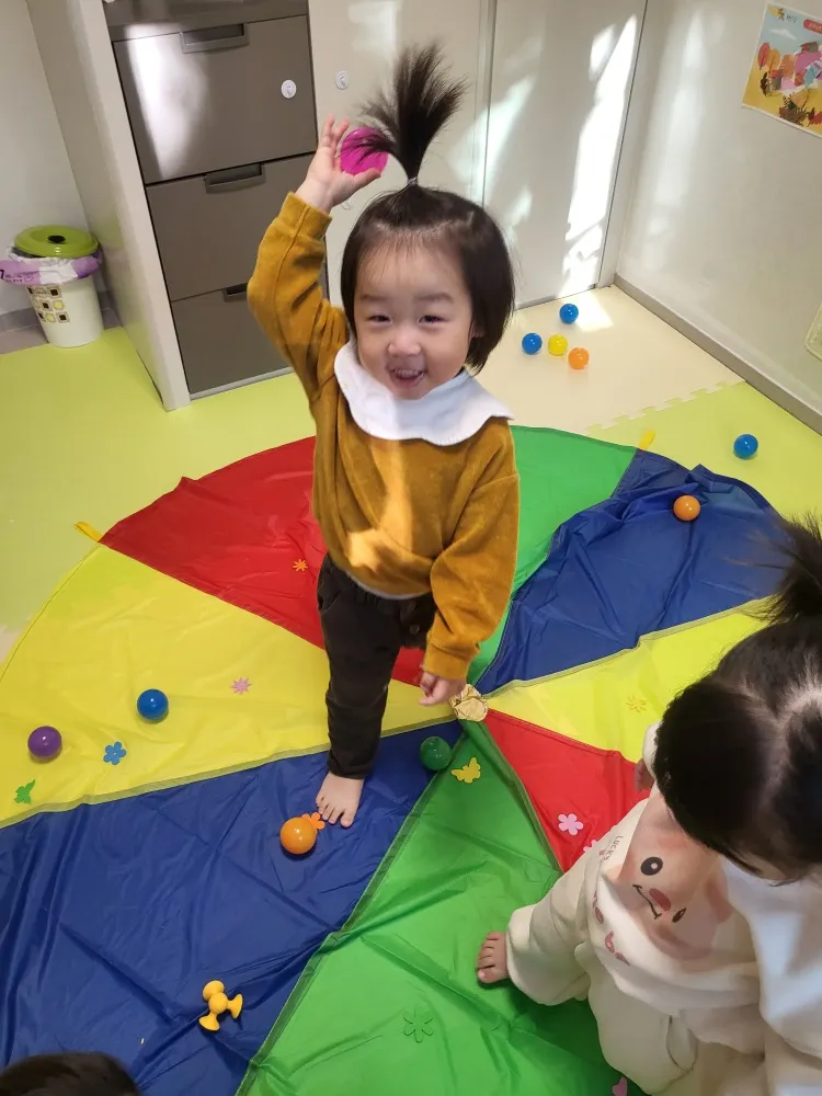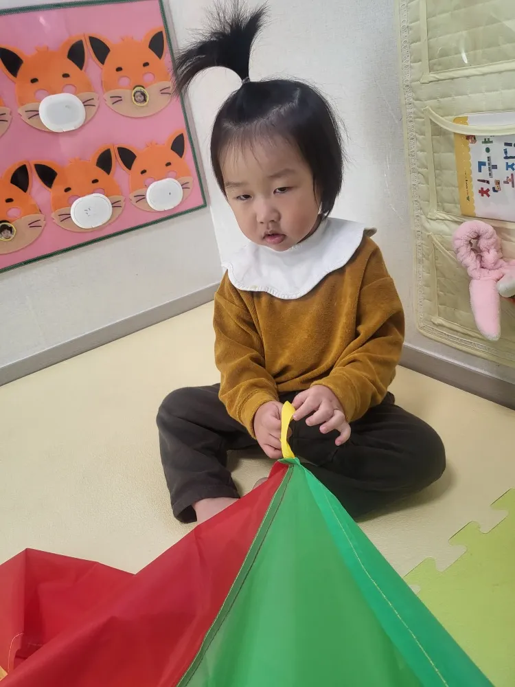 넓게 펴서 자기가 좋아하는 색에 앉아보기도 하고 하고 누워보기도 하고 여러 가지 모양의 스티커 붙여보기 했어요~