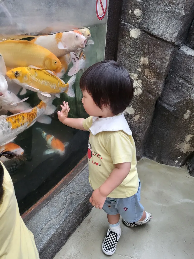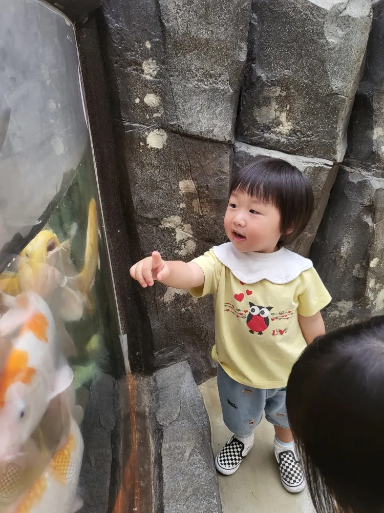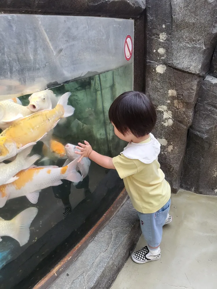버드파크에 들어서자 제일 먼저 보이는 큰 물고기를 가리키며"이거 이거~하며 보러 가재요~
