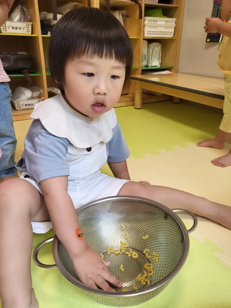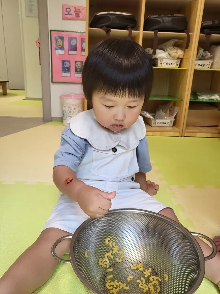 마카로니를 이용해 만져보기도 하고~그릇에 담아보기도 하며~ 자유롭게 놀이했어요