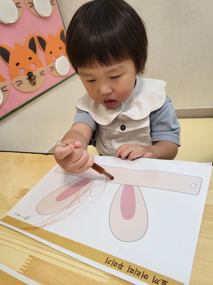 오늘은 토끼머리띠 그림 위에  끼적이기도 하고 스티커도 붙여보았어요~
